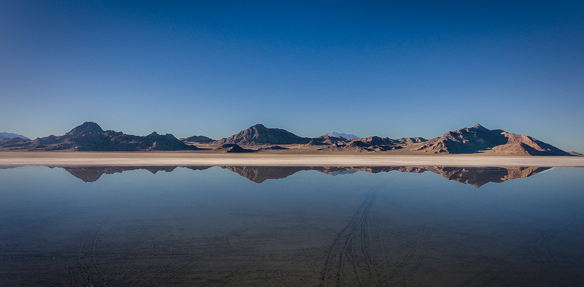 A thin sheet of water covers the Bonneville Salt Flats, replenishing the layer or salt for which the speedway is famous.