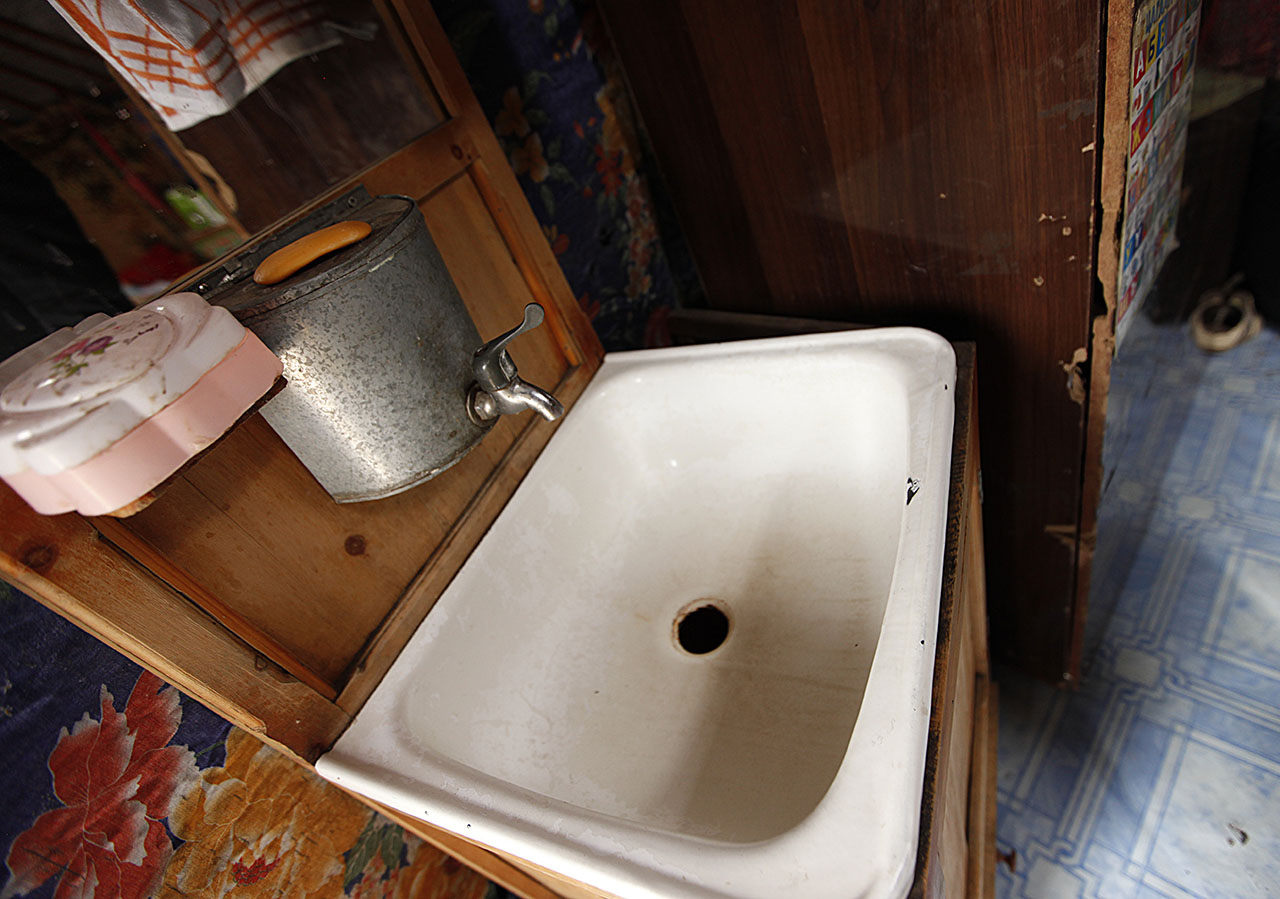 The bucket with spigot above the wash basin is the water supply for hand washing and showering.
