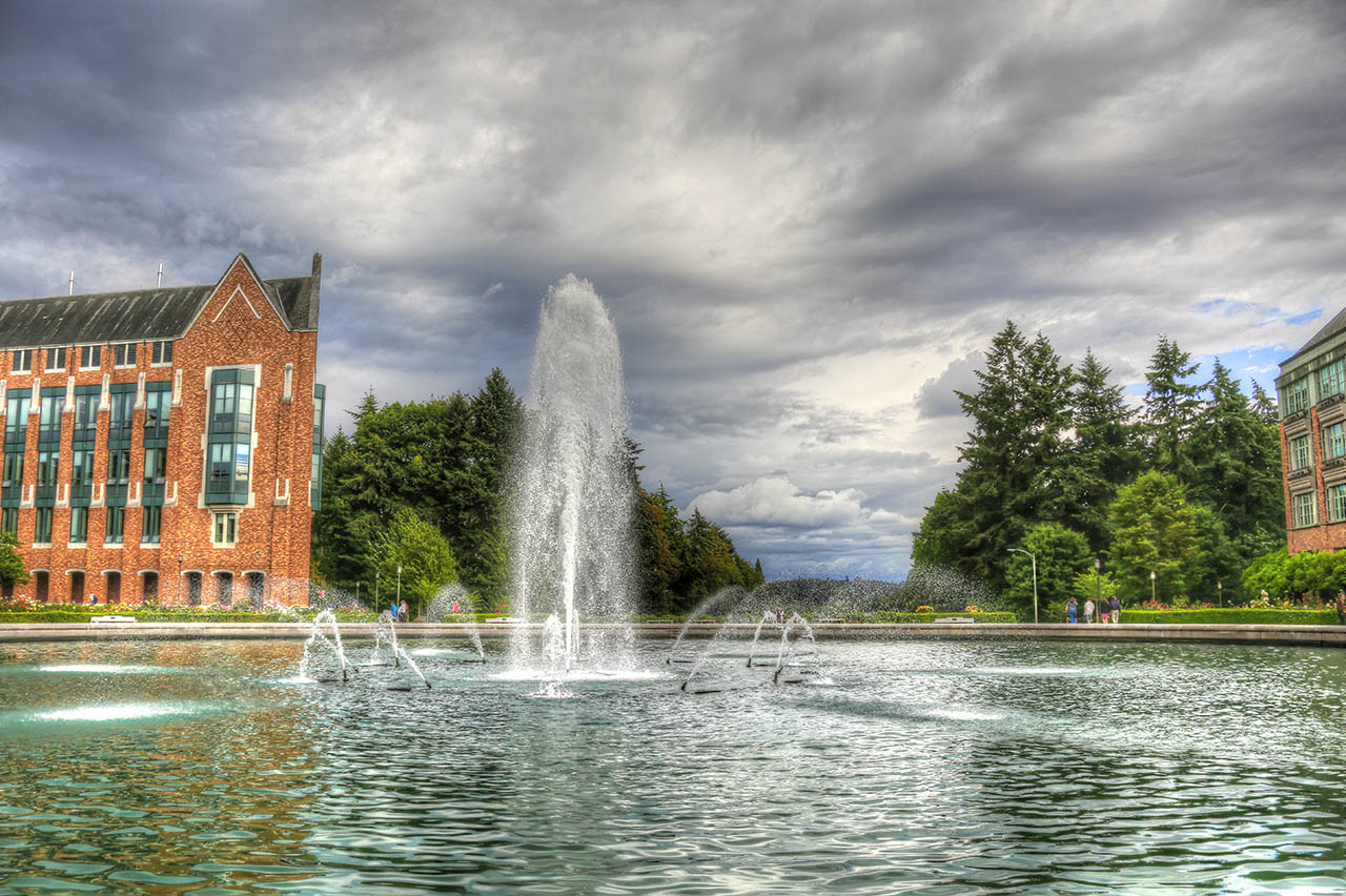 Drumheller Fountain adds an element of peace to the brooding sky and brick buildings of UW Campus.