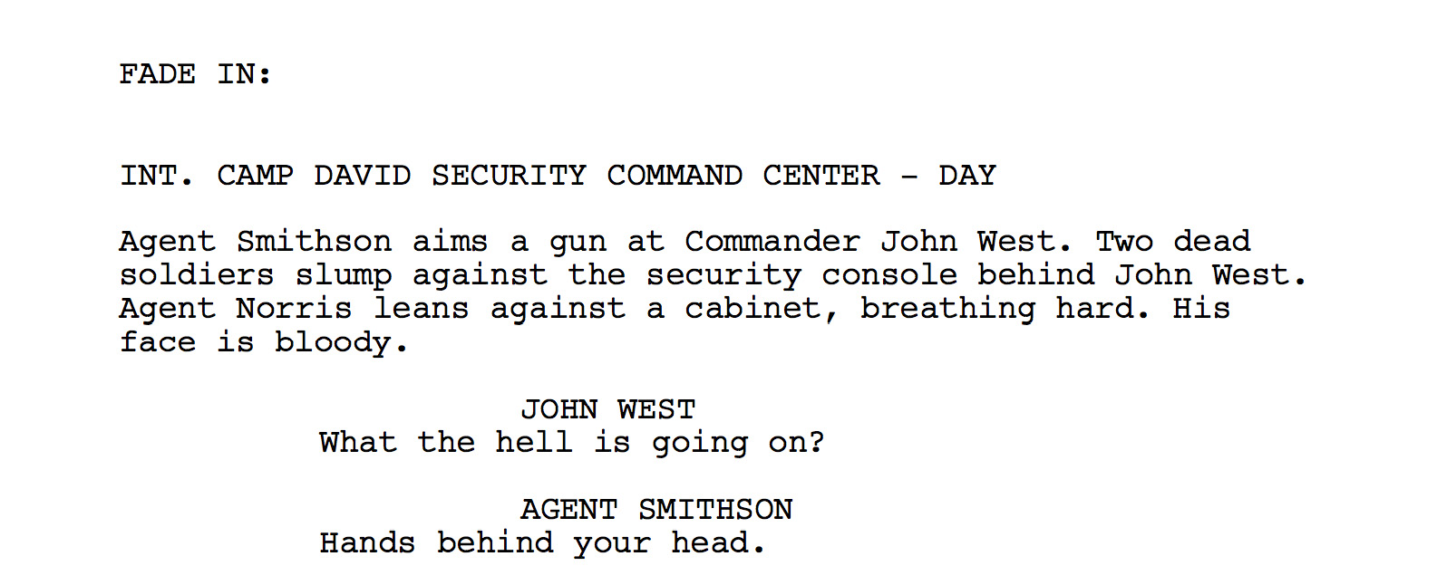 John West, Navy Seal Commander, head of security for Camp David is framed by the President for murdering the Chief Justice of the Supreme Court. Events happen in real time.