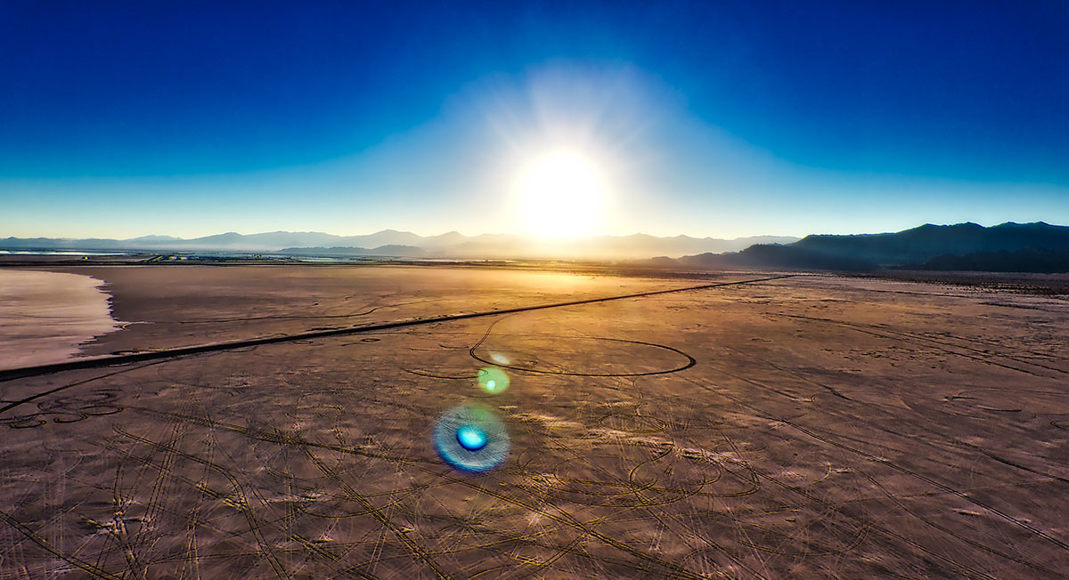 The setting sun turns the white salt golden on the Bonneville Salt Flats, as seen from above.