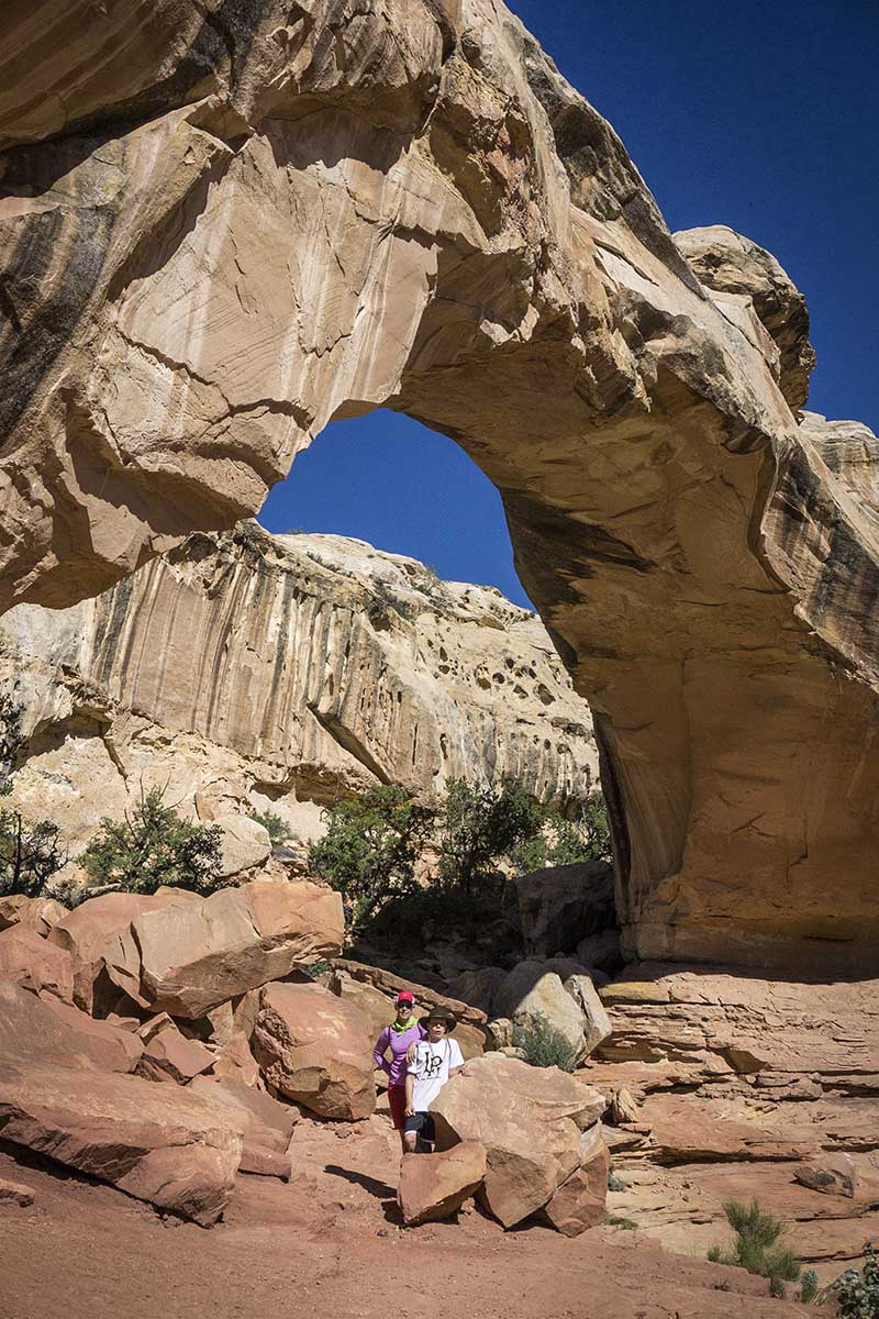 DSC03496_Hickman Bridge_Anne_Davy August 5, 2015 800 × 1200 DSC03496_Hickman Bridge_Anne_Davy Anne and Davy stand below 125 foot high Hickman Bridge. Anne and Davy stand below 125 foot high Hickman Bridge.