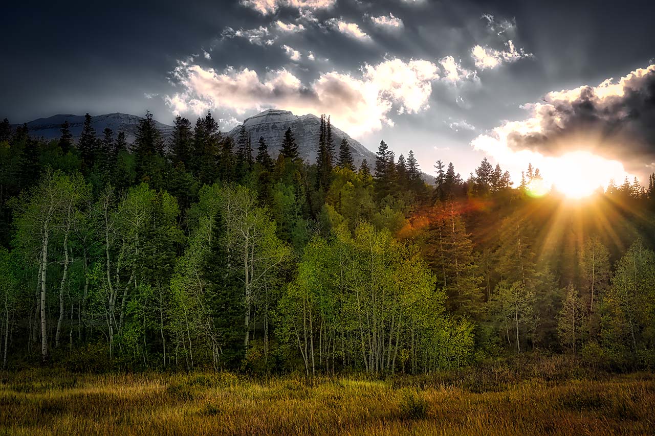 Aspen trees and evergreens catch the last rays of sun near Mount Timpanogos, Utah.