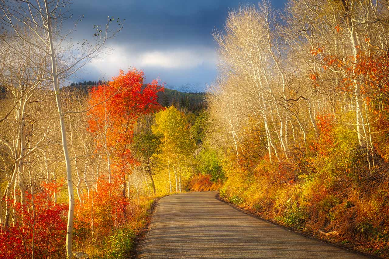 The setting sun highlights fall colors and gathering clouds on the Alpine Loop above American Fork Canyon, Utah.
