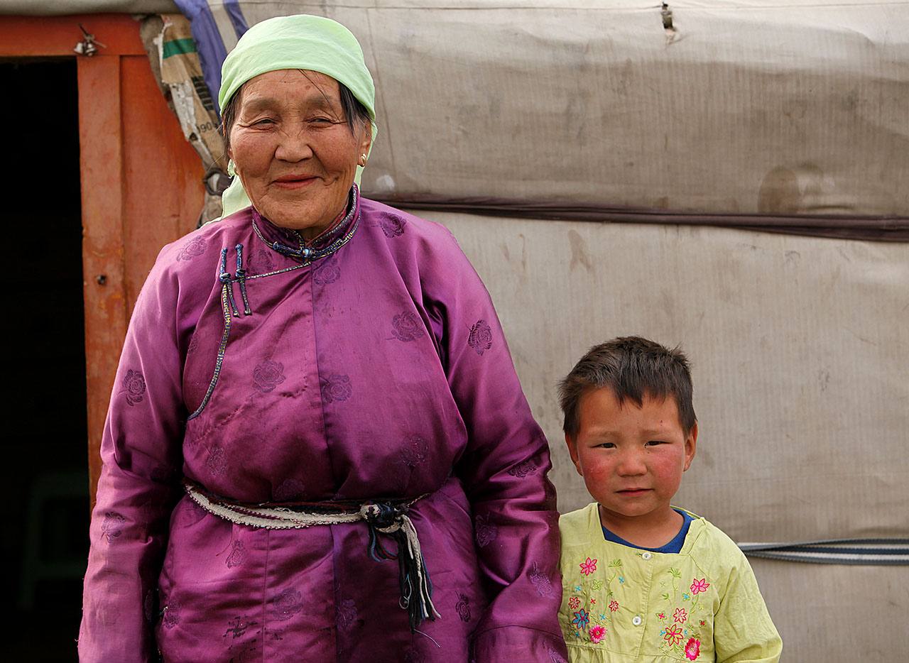 Still dressed in her traditional costume, this Mongolian grandmother protects her little grand daughter outside the family yurt.