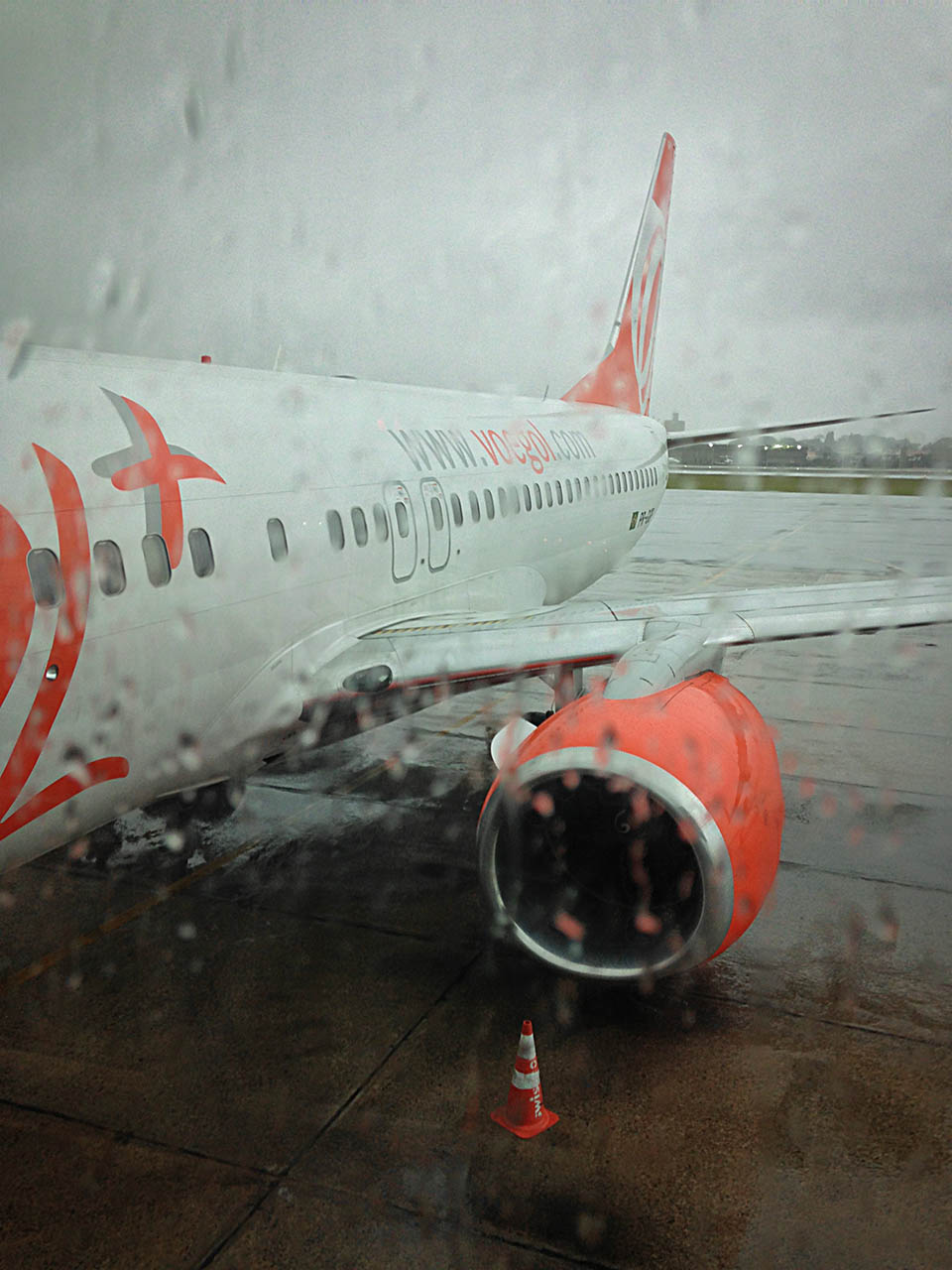 A Brazilian Voegol Airlines 737 sits in the rain while we wait for the storm to clear.