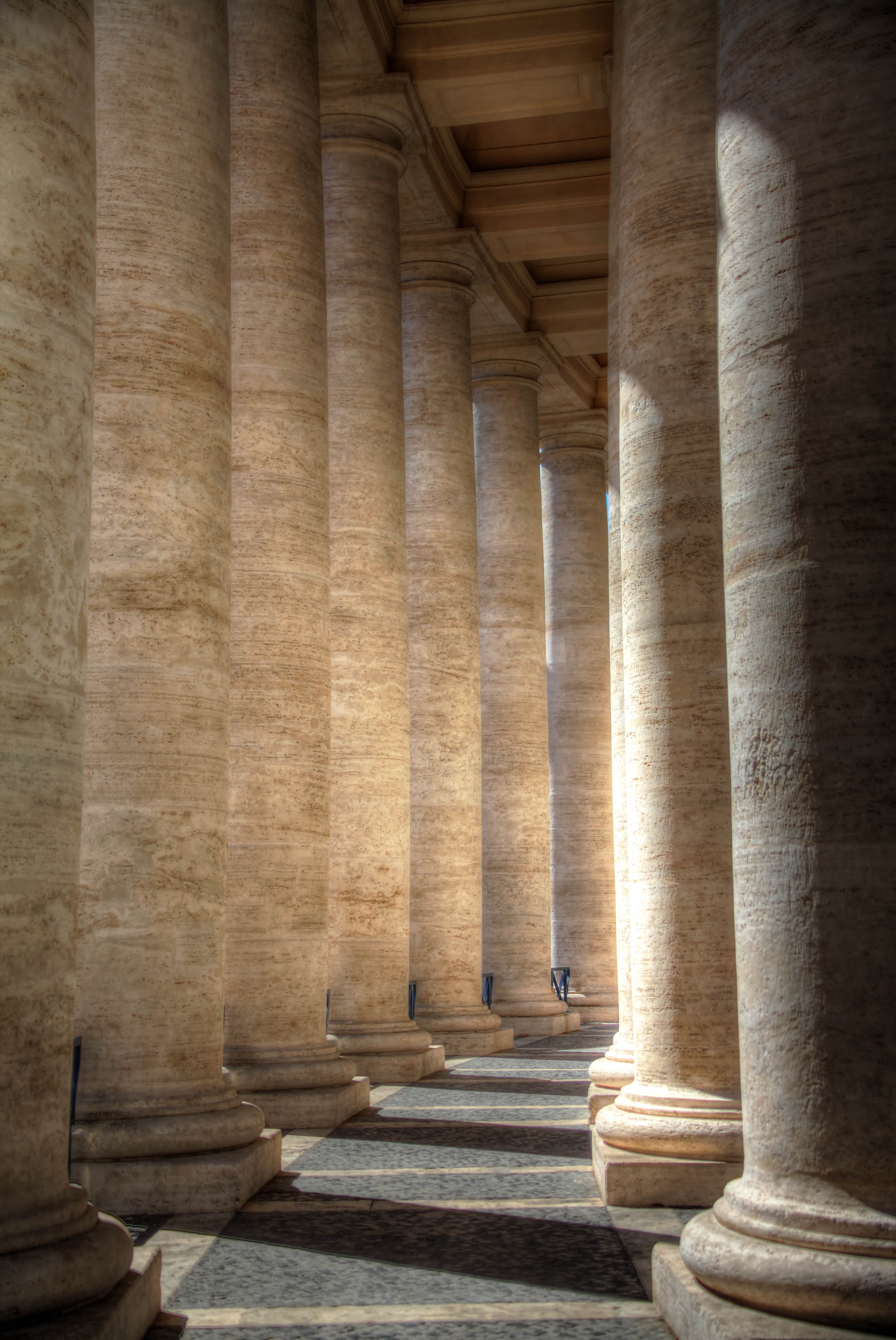 Massive stone pillars provide support near the grand entrance to St. Peter’s Square.