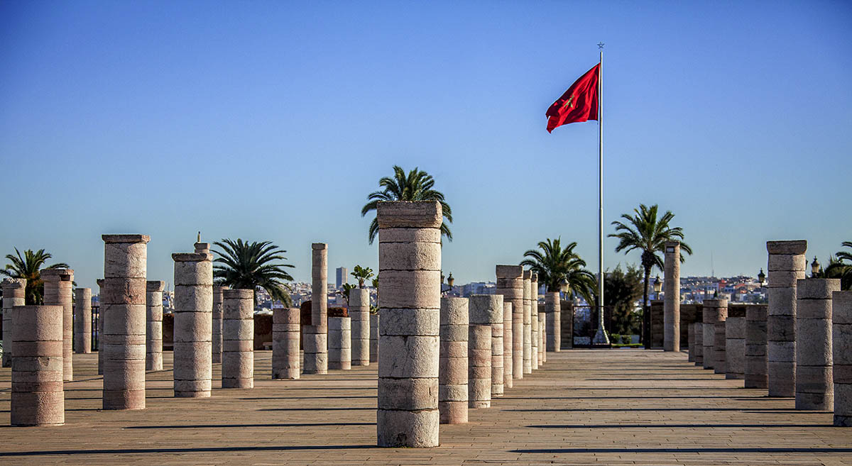 The official flag of Morocco flies over stone pillars, remnants of the walls of Hassan Tower, in the palace court of Mohammed VI, King of Morocco.