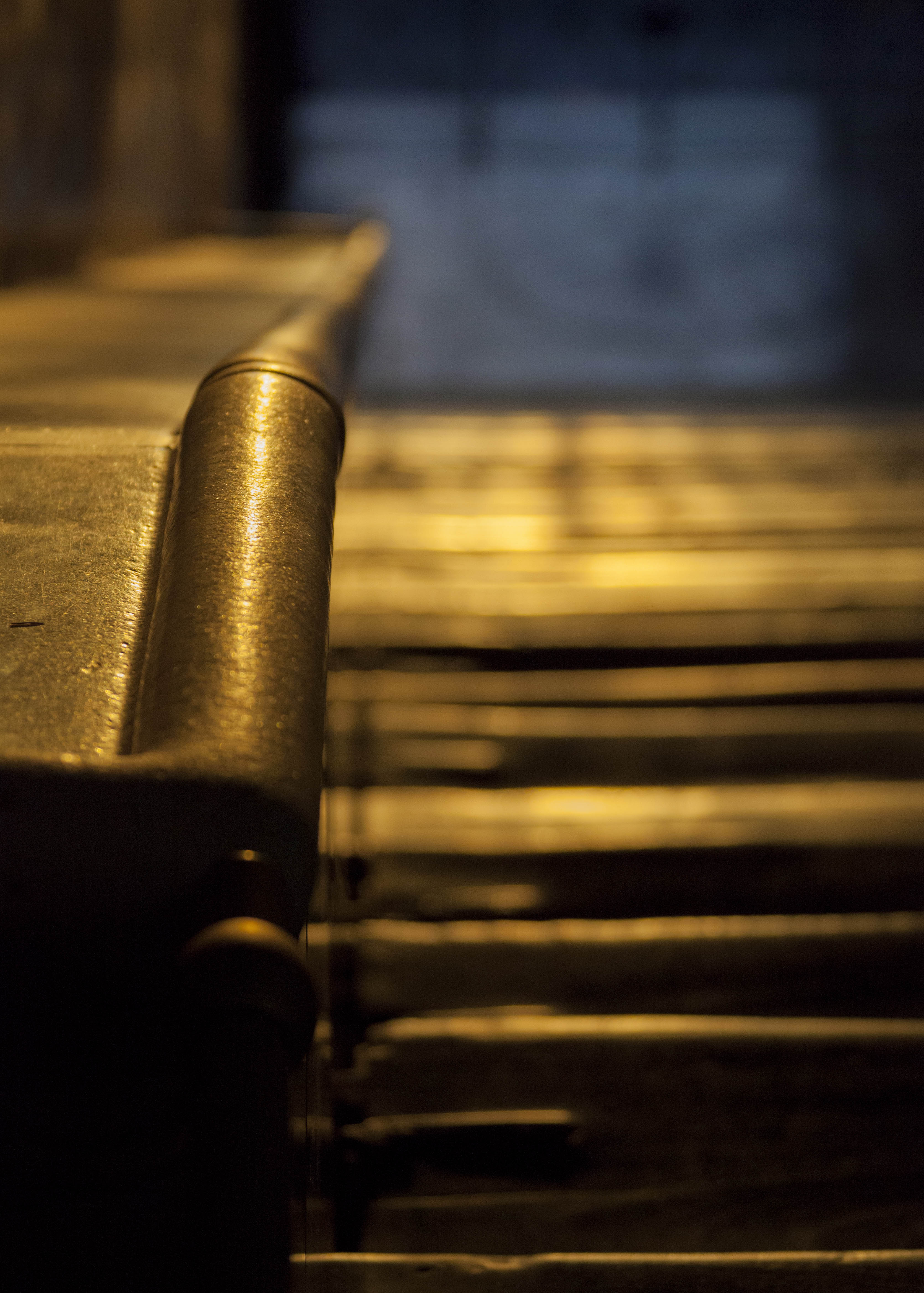 Golden light bathes one of four common staircases leading to the Chapel of St. Lawrence, immediately adjacent to the Jerusalem Steps.