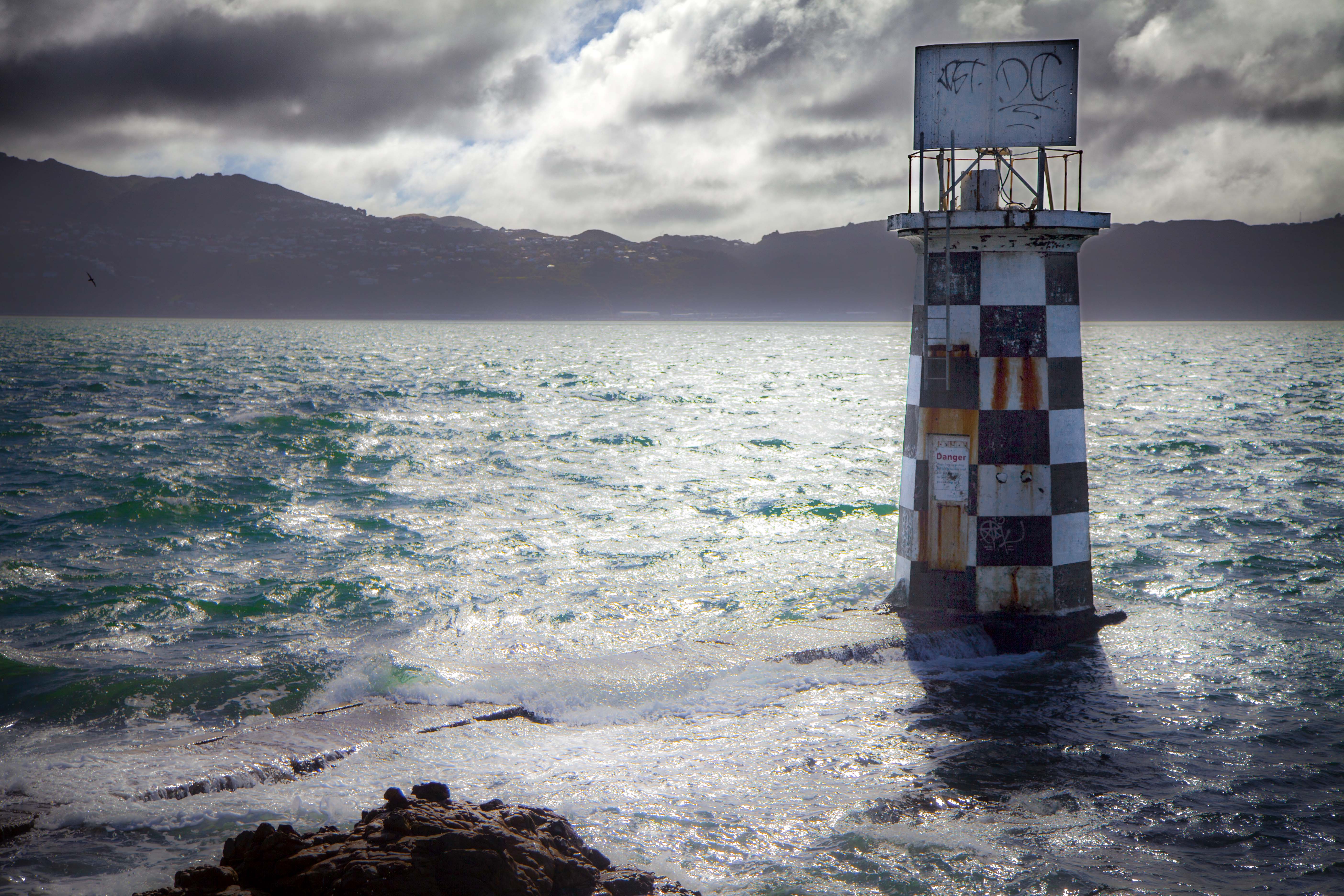 At the entrance to Wellington Harbor, this rusty lighthouse stands guard.