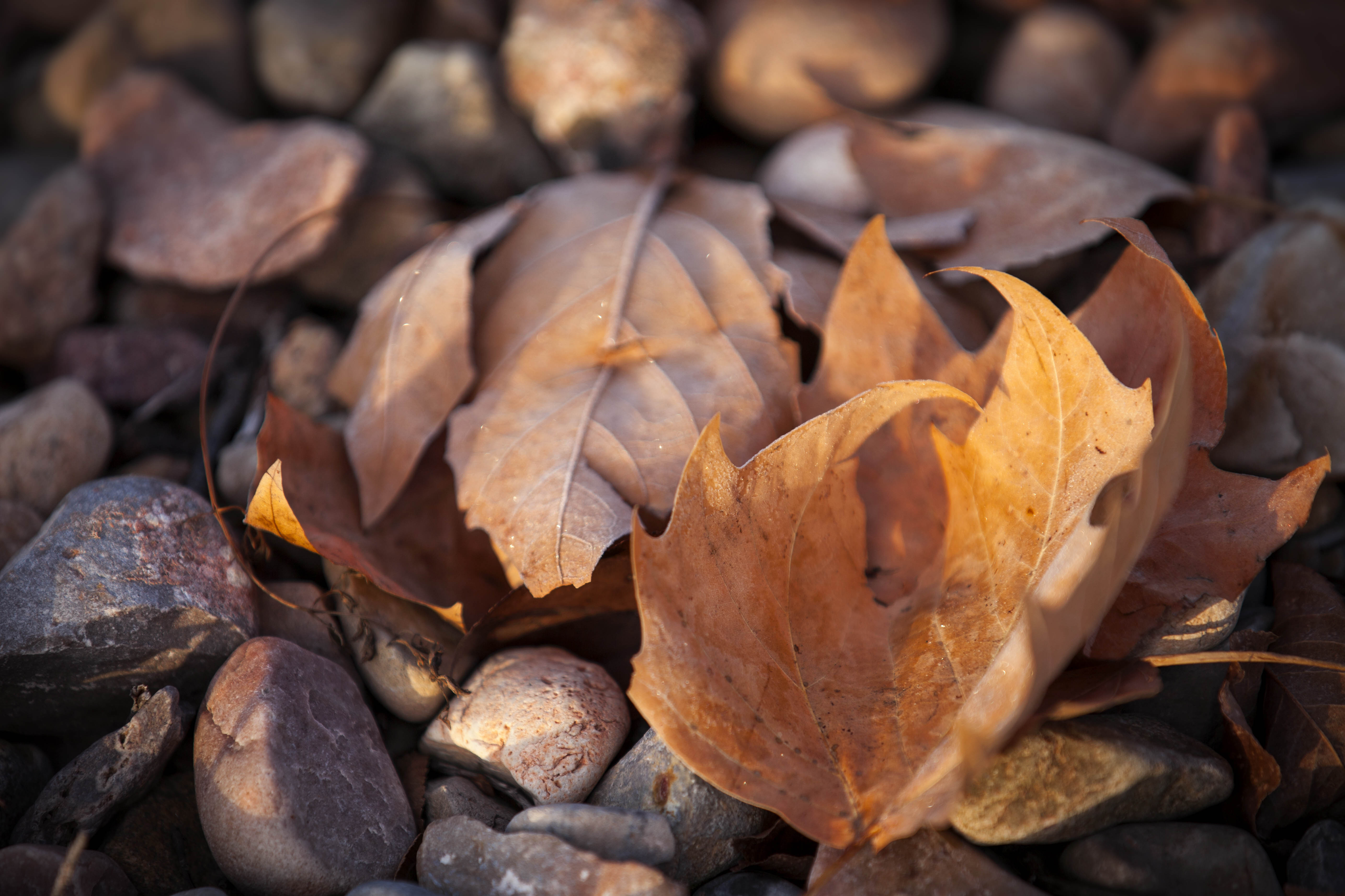 Leaves and Stones November 30, 2013 5616 × 3744 Leaves and Stones On the banks of a meadow stream, fall leaves cover smooth stones. On the banks of a meadow stream, fall leaves cover smooth stones.