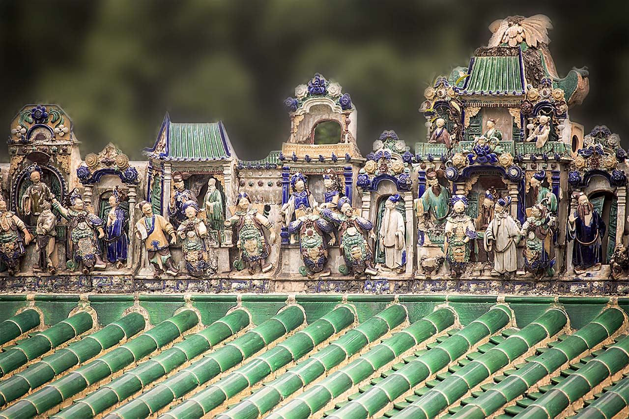 Above the tile roof of a Hong Kong Temple, detailed ceramic artwork tells the story of rich religious tradition.